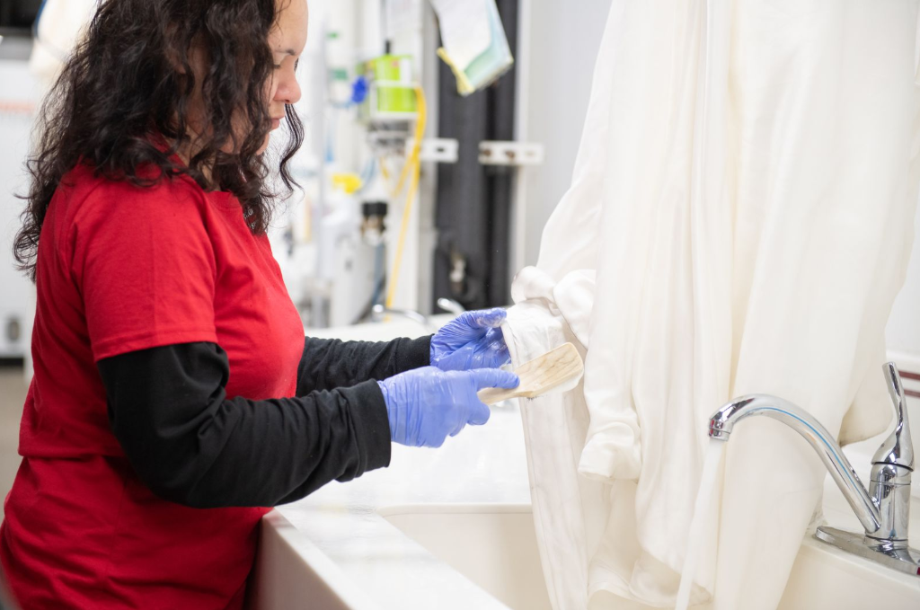 In the first step, a brushing solution is applied to remove tough stains, such as sweat and grass, particularly those that appear around the hemline of wedding dresses.