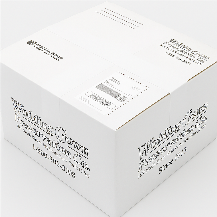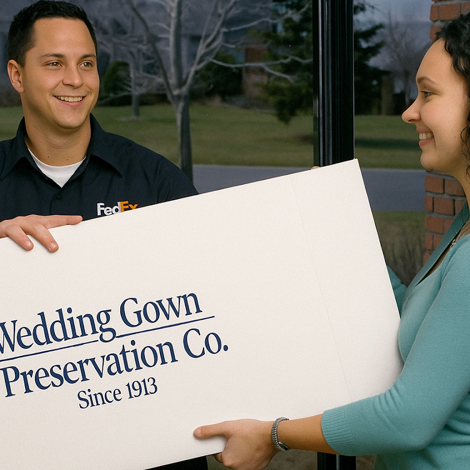 Once your wedding dress preservation kit arrives, the next step is to pack and send your wedding gown to us carefully. You’ll receive the shipping kit within 3 to 5 days via FedEx, which measures 2' x 2' x 1½'.