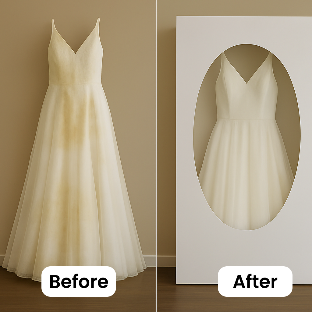 Below, we have shared some of the pictures of the restorations we have done for clients with our wedding dress restoration kits. These amazing transformations highlight the level of expertise our professionals use to restore the original beauty of your wedding dress. If we can bring these dresses back to their original beauty, imagine what we can do for yours.